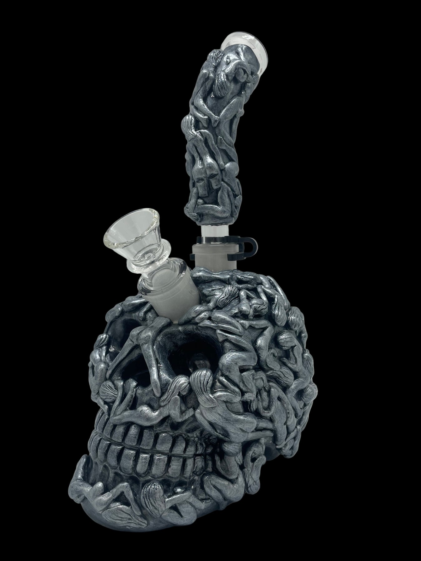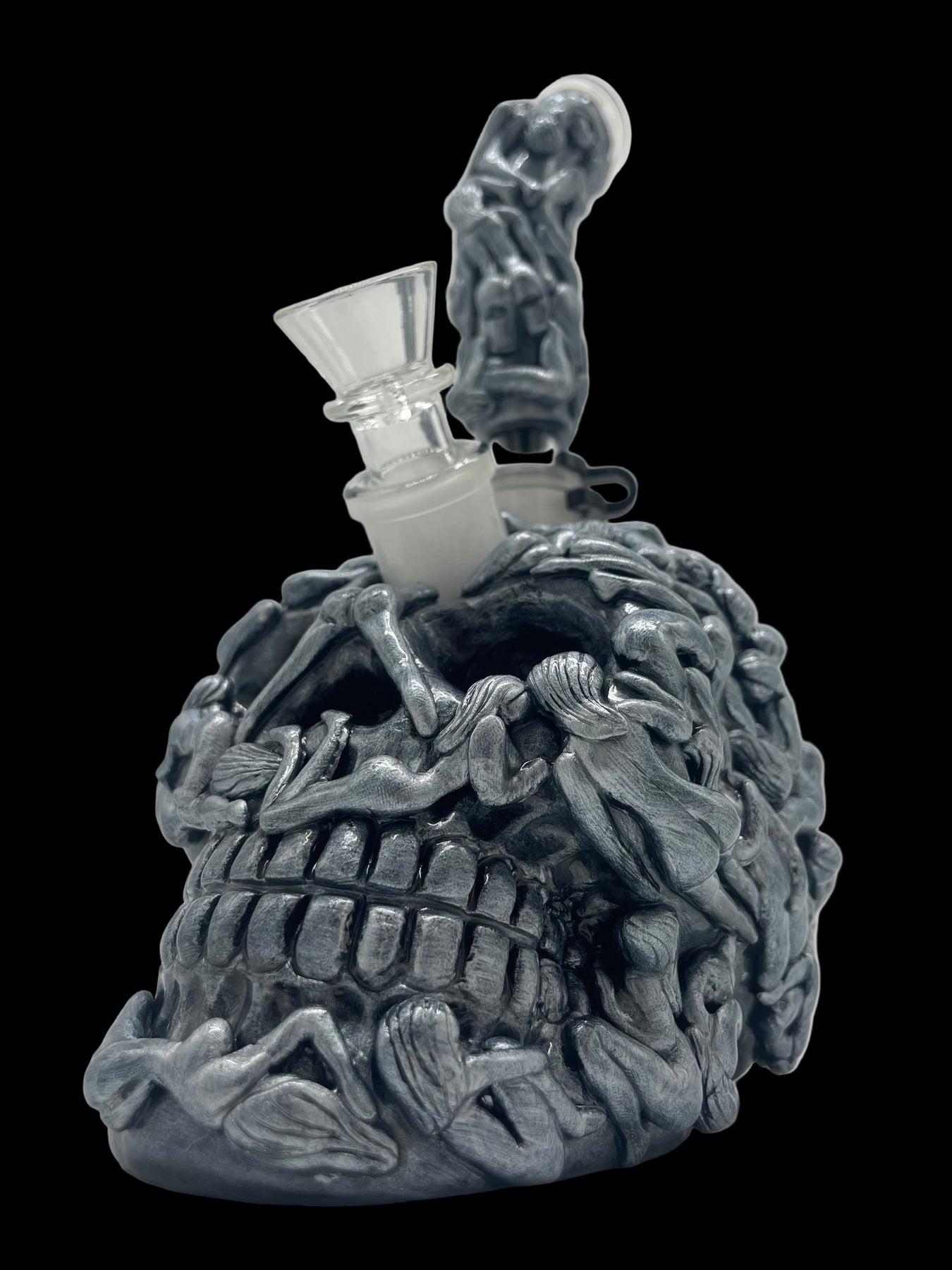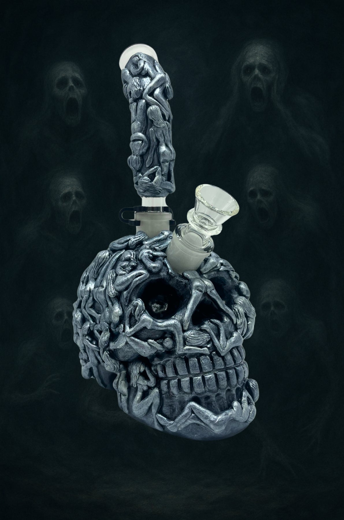 Unleash a haunting smoking experience with the Soul Train Bong, a mesmerizing Skull bong that blends dark artistry with exceptional functionality. Handcrafted from durable borosilicate glass, this skull bong features a striking gray skull base adorned with intricate, tormented soul figures entwined across its surface—perfect for those seeking a unique bong to enhance their collection and add an absolute show stopper of a piece.