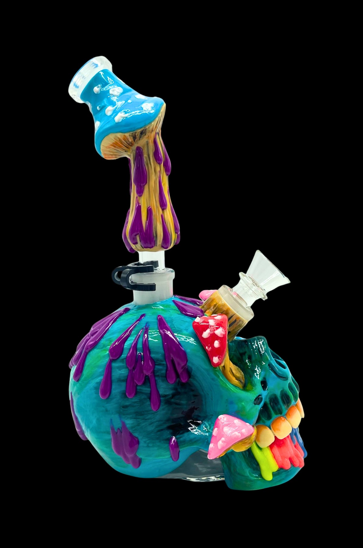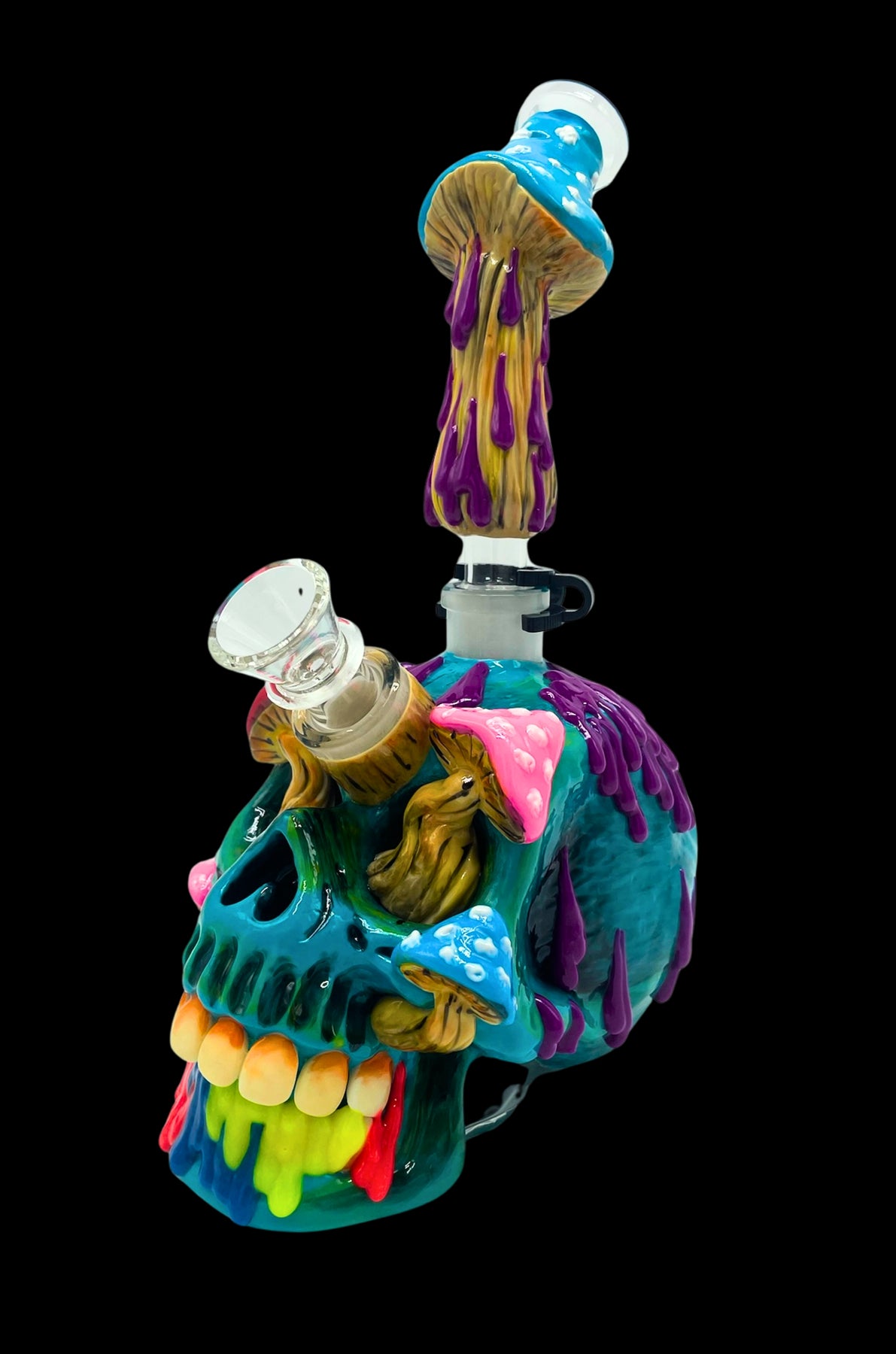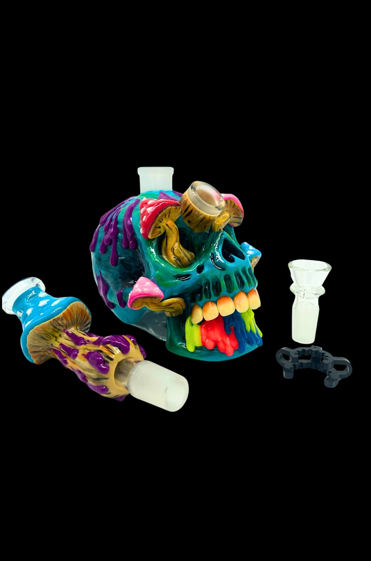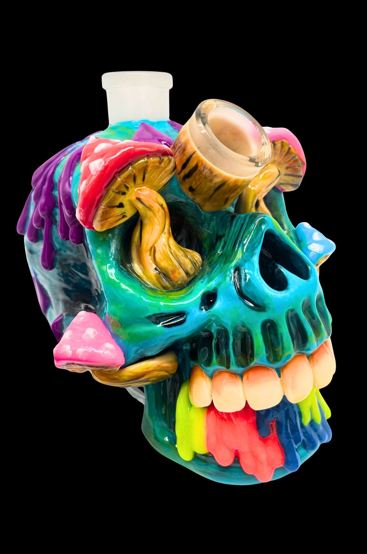 Illuminate your smoking sessions with the Infected Skull Bong GLOW, a striking bong that fuses eerie skull design with colorful psychedelic mushroom flair. This handcrafted glow-in-the-dark bong features a vibrant teal skull base overrun with colorful, dripping mushrooms in purple, pink, and yellow, glowing eerily in the dark—perfect for those seeking a unique bong to elevate their collection.