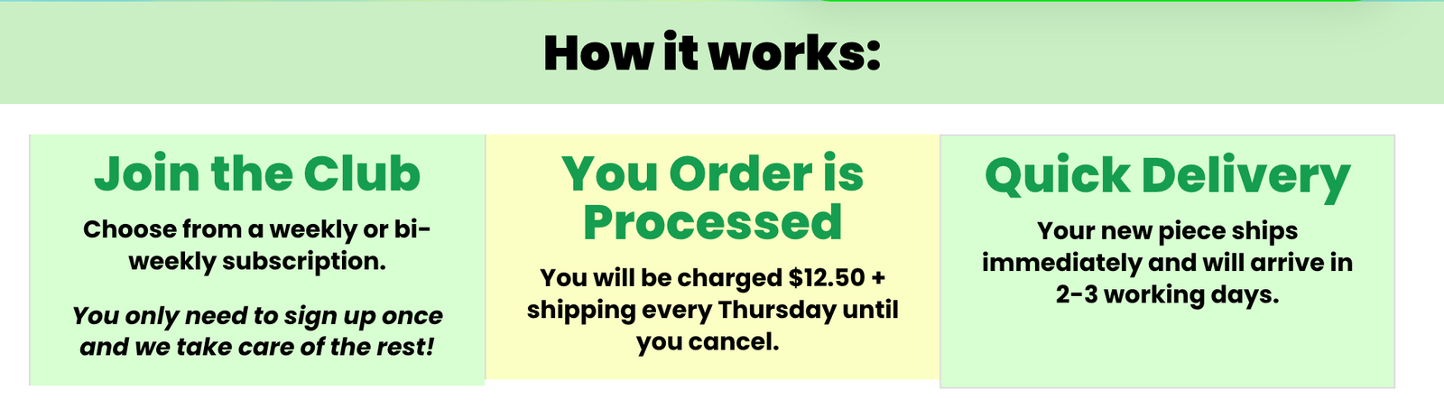 For just $12.50/week, you will receive a brand new piece in the mail every single week. You only need to sign up once and we take care of the rest!